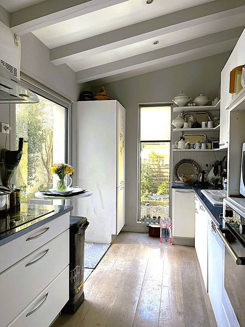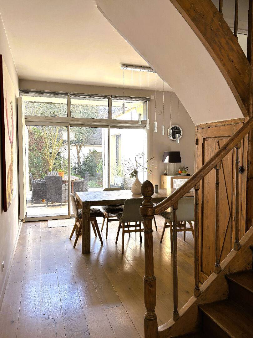 Le rez-de-chaussée accueille une belle pièce de vie traversante, prolongée par une grande baie vitrée à galandage ouvrant sur la terrasse et le jardin. La cuisine semi-ouverte, fonctionnelle et conviviale, offre un accès direct vers l'extérieur.