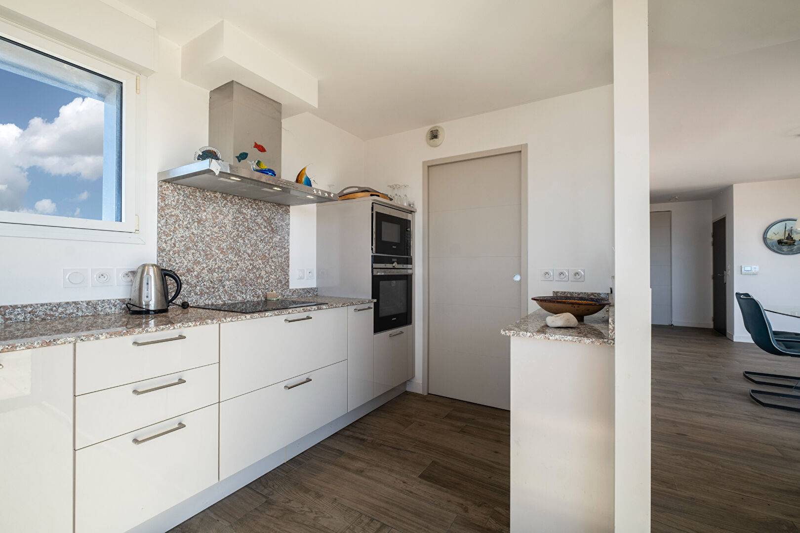 Appartement traversant , cuisine aménagée et équipée avec vue sur les tours de La Rochelle, cellier, 3 chambres dont une suite parentale, terrasse de 9.03 m², deux salles d'eau, deux WC, deux garages fermés en sous-sol. Total terrasses 63 m².