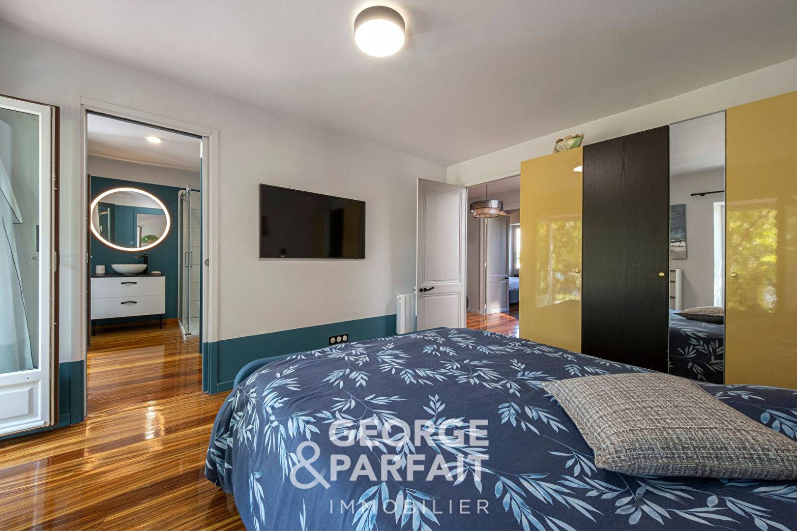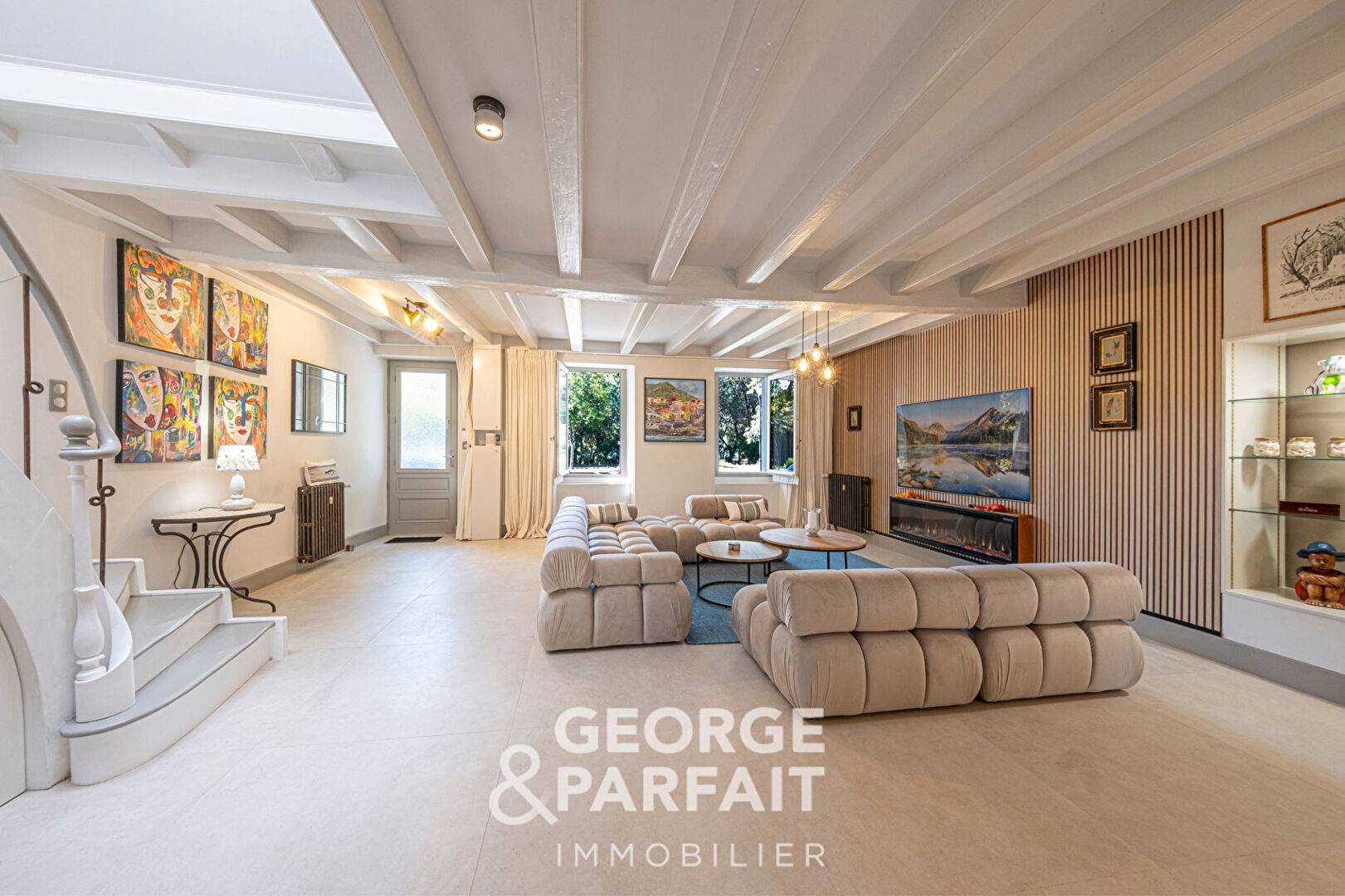 Vous serez séduits par le charme de cette maison entièrement rénovée avec des matériaux de qualité. Les beaux volumes de la pièce de vie de 65 m² créent une atmosphère de bien-être et de convivialité. La cuisine d'une superficie de 21 m², lumineuse et agréable vous fera profiter de la vue sur le magnifique jardin paysagé, soigneusement entretenu et la terrasse sans vis-à-vis.
