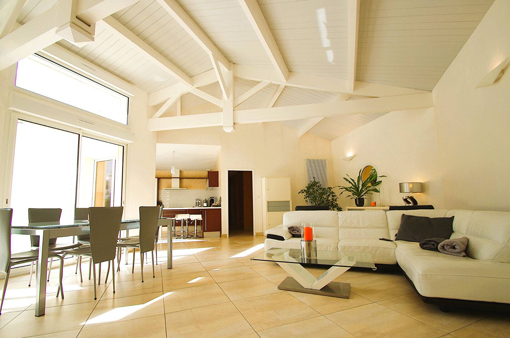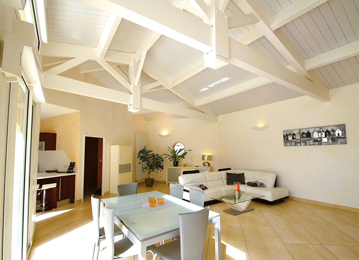Dès l'entrée, vous serez séduits par ses volumes généreux, ses rangements nombreux et sa luminosité exceptionnelle. La pièce de vie de 65 m², exposée sud-ouest, profitant d'une belle hauteur sous plafond, d'une charpente apparente et d'une cheminée insert vous installe dans une ambiance chaleureuse. Cet espace s'ouvre sur une spacieuse et fonctionnelle cuisine aménagée-équipée, dotée d'un cellier qui vous permettra de partager d'agréables moments en famille ou entre amis.