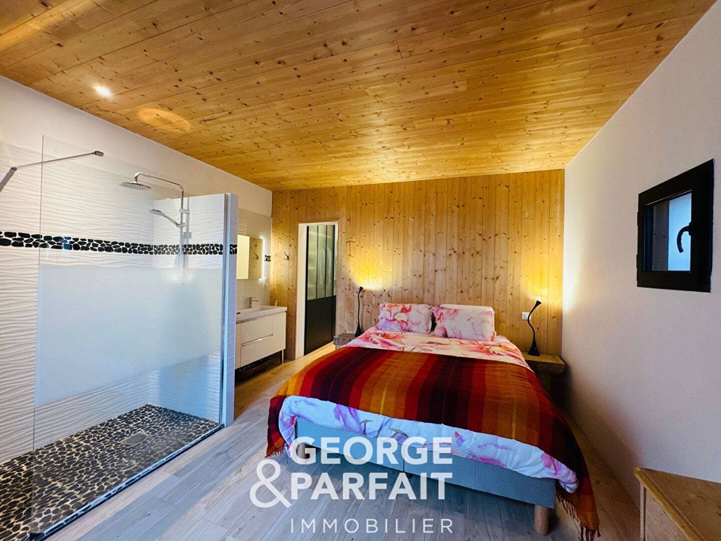 Elle se compose d'une entrée donnant sur une vaste pièce de vie baignée de lumière avec poêle à bois, cuisine ouverte aménagée et équipée.