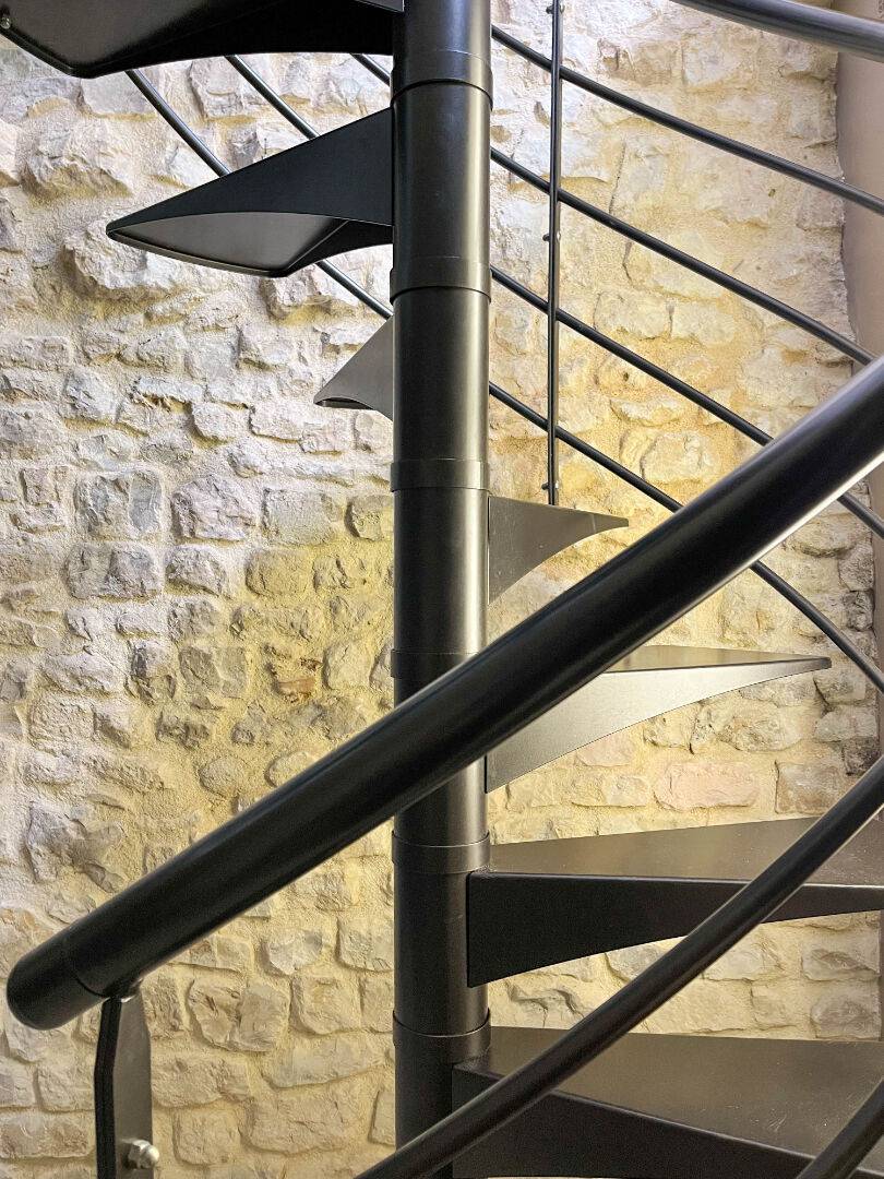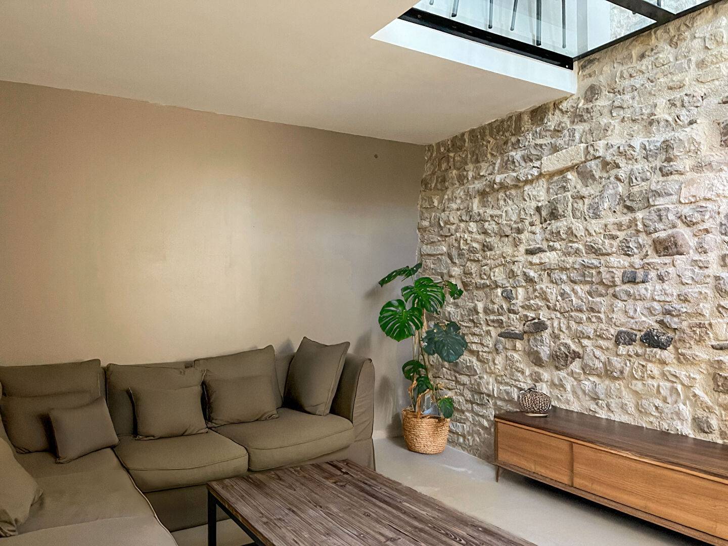Dès l'entrée, on découvre une pièce de vie sublimée par un mur en pierre apparente. Cet espace se déploie sur deux niveaux, reliés par un escalier hélicoïdal en métal et une verrière au sol, offrant un jeu de transparence avec le salon au niveau inférieur. La cuisine aménagée et équipée se glisse sous l'escalier en bois d'origine, ajoutant charme et praticité.