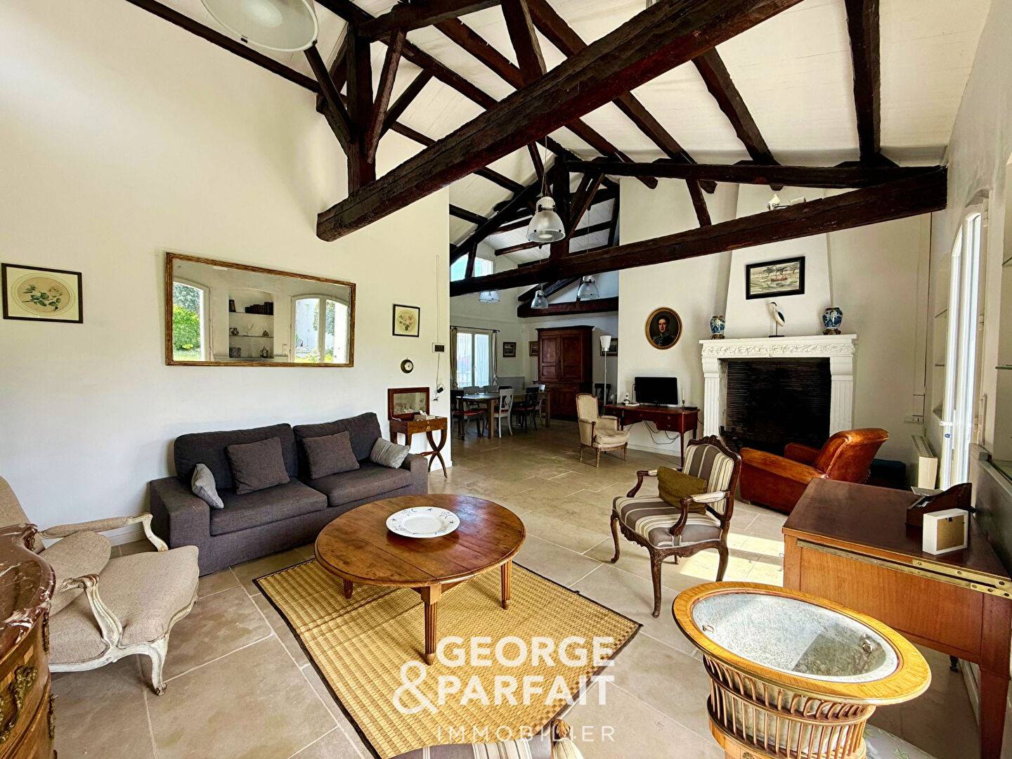 La maison principale, d'environ 130 m², dévoile de beaux volumes baignés de lumière. Son vaste salon-séjour, sublimé par une cheminée ouverte et un plafond cathédrale mettant en valeur une remarquable charpente apparente, offre une atmosphère chaleureuse et authentique. La cuisine, entièrement aménagée et équipée, s'accompagne d'une buanderie. L'espace nuit se compose de quatre chambres, dont une élégante suite parentale, ainsi qu'une salle d'eau.
